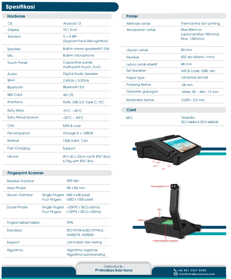 M - One AlO1000 adalah perangkat terminal biometrik yang dirancang untuk memenuhi kebutuhan autentikasi dan verifikasi identitas secara cepat, akurat, dan aman. M - One AIO1000 menggabungkan teknologi multi-biometrik dengan performa tinggi, cocok untuk berbagai sektor seperti perbankan, layanan publik, dan keamanan akses. M - One AlO1000 juga dilengkapi dengan printer termal built-in cepat & efisien. Kompatibel dengan berbagai karakter dan format cetak.