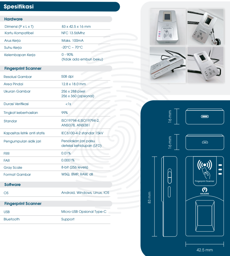 Dilengkapi dengan teknologi NFC dan RFID, Majore FB1000 mampu melakukan autentikasi berbasis kartu dan tag pintar, menjadikannya pilihan tepat untuk sistem keamanan dan verifikasi identitas yang modern.