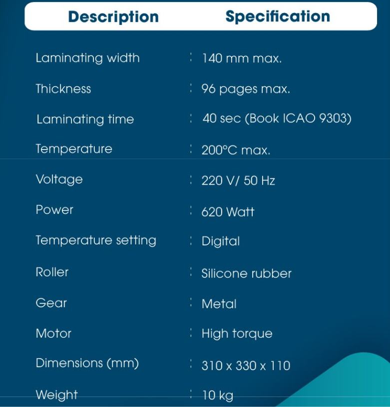 With two heater assemblies and three sets of feed rollers, the laminator is designed for effecient operation. The first heater assists in drying the book and pre-heating the laminate, while the second heater stage raises the book to the required temperature to complete the lamination process. The two-way motor provides user with the ability to extract passport in case of abnormal operation.